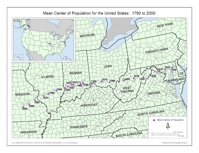 “The center is determined as the place where an imaginary, flat, weightless and rigid map of the United States would balance perfectly if all residents were of identical weight…..Historically, the center of population has followed a trail that reflects the sweep of the nation's brush stroke across America's population canvas.