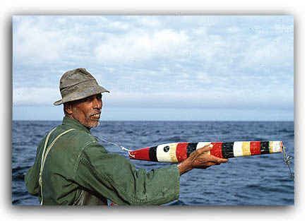 The 2 main industries on the islands are fishing and rum production (sugar cane). Here is a fisherman in an outrigger canoe showing his lure for catching wahoo. From: http://john_laplant.tripod.com/links.html